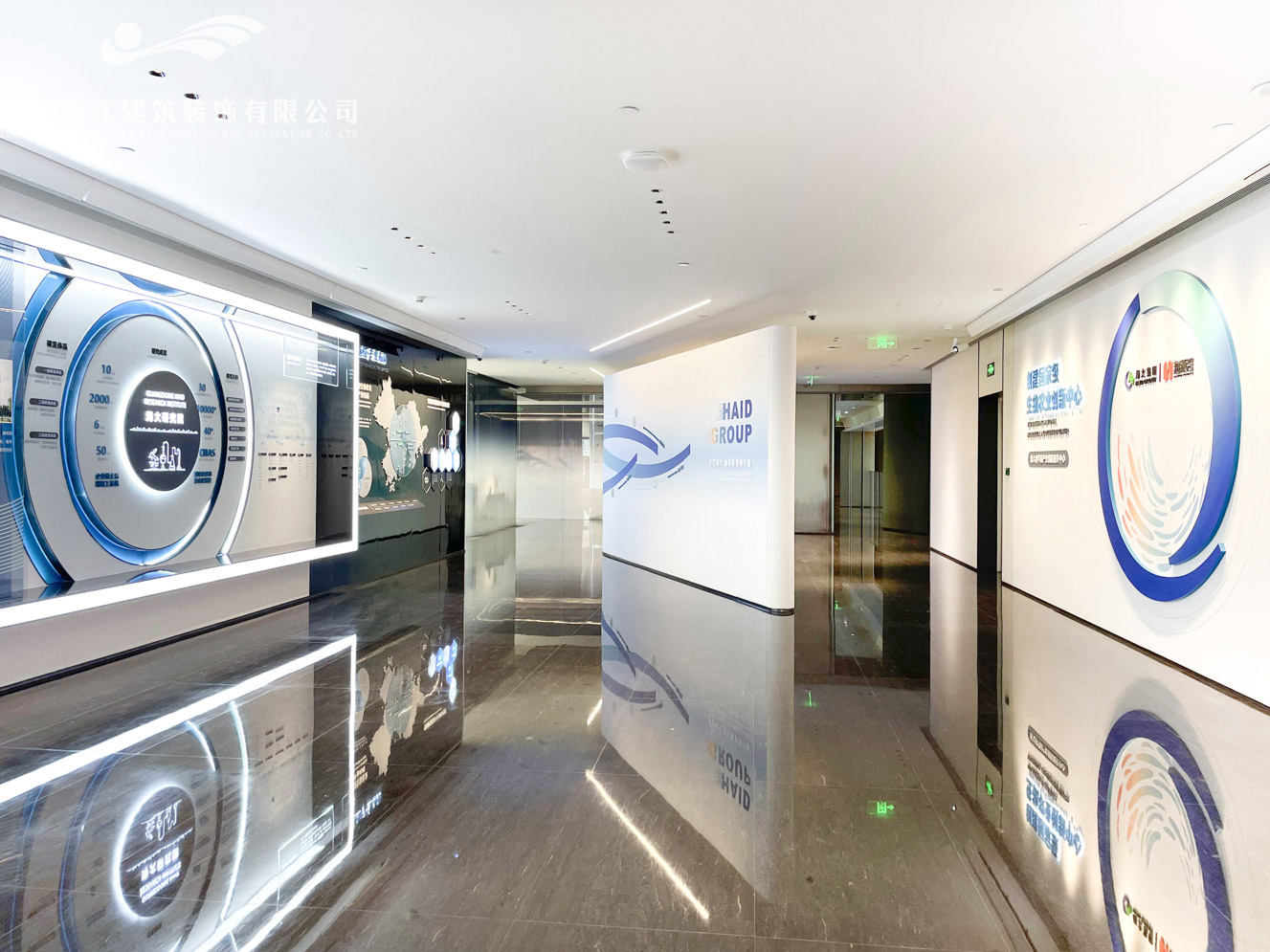 海大科学园的建筑外观采用现代简约的设计风格,以玻璃幕墙为主,搭配金属框架,展现出通透、轻盈的视觉效果。建筑线条流畅,园内设置了多个功能区域,咨询台、休息区、会议室、展示区以及洽谈区等主要重点区域。